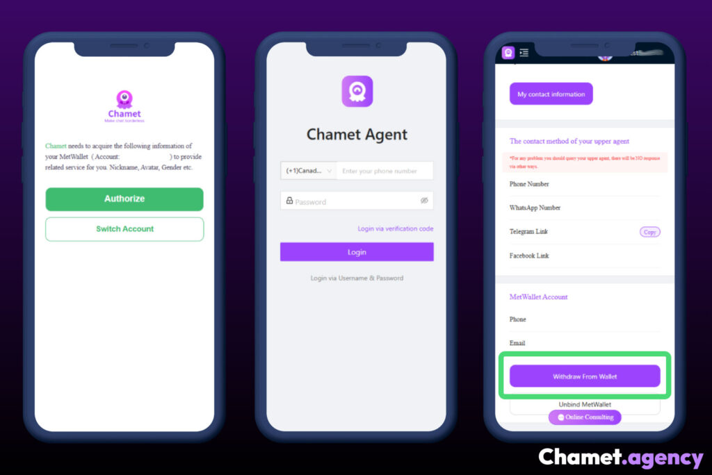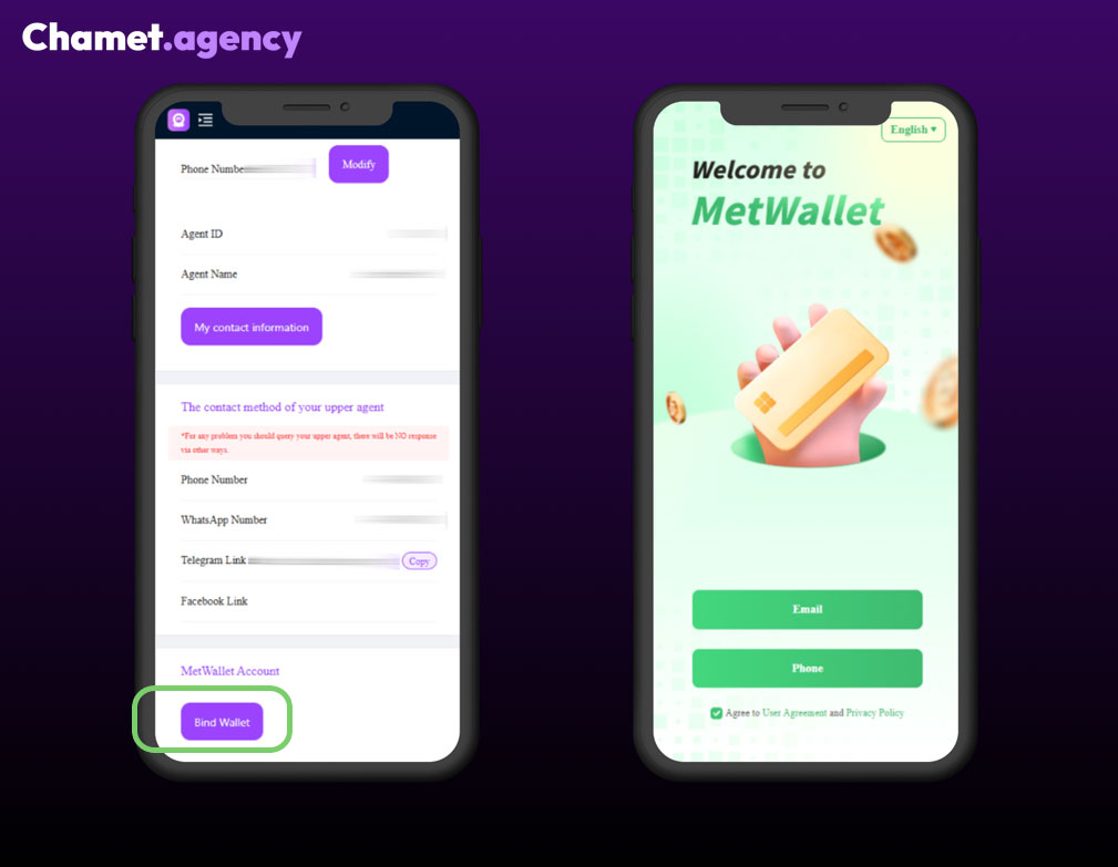 Para recibir pagos de comisión, los agentes deben conectar su cuenta a MetWallet, que es la plataforma oficial de retiros utilizada por Chamet.